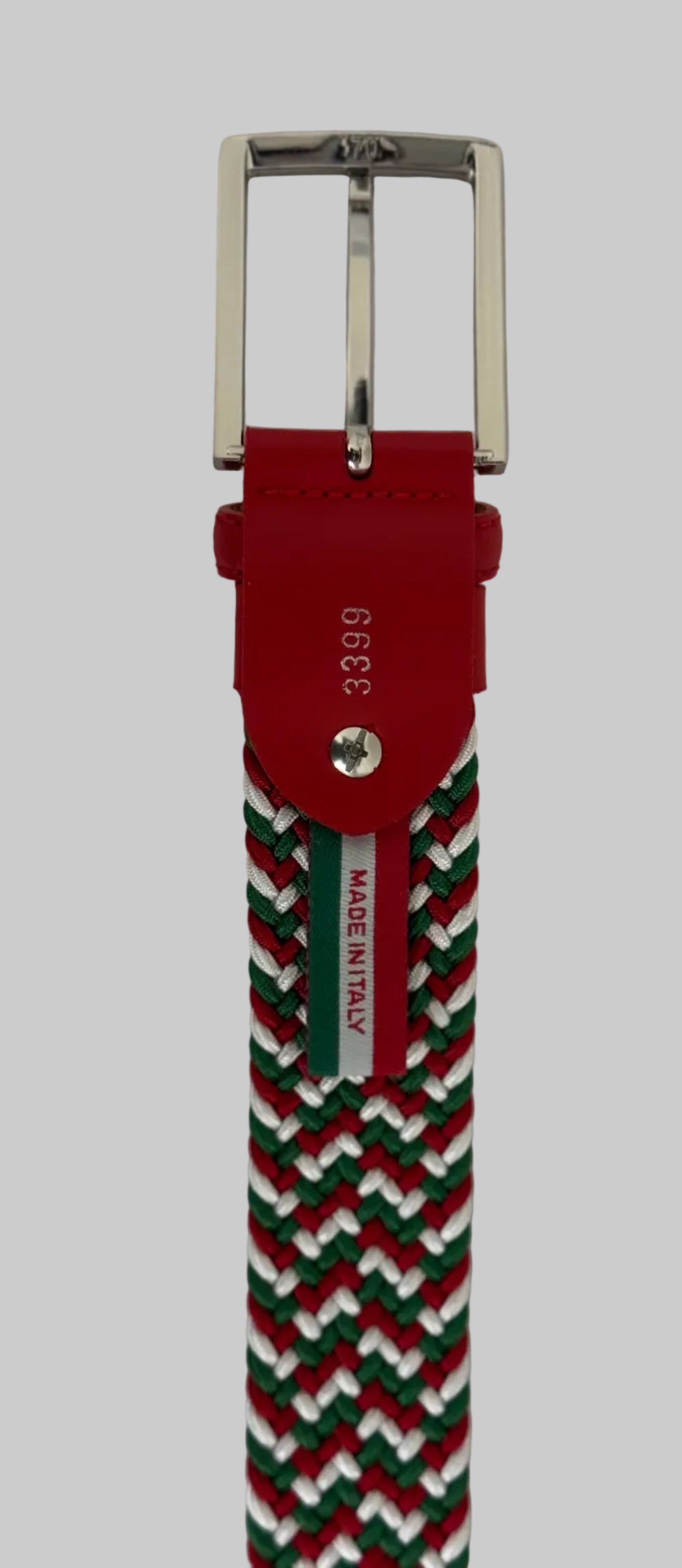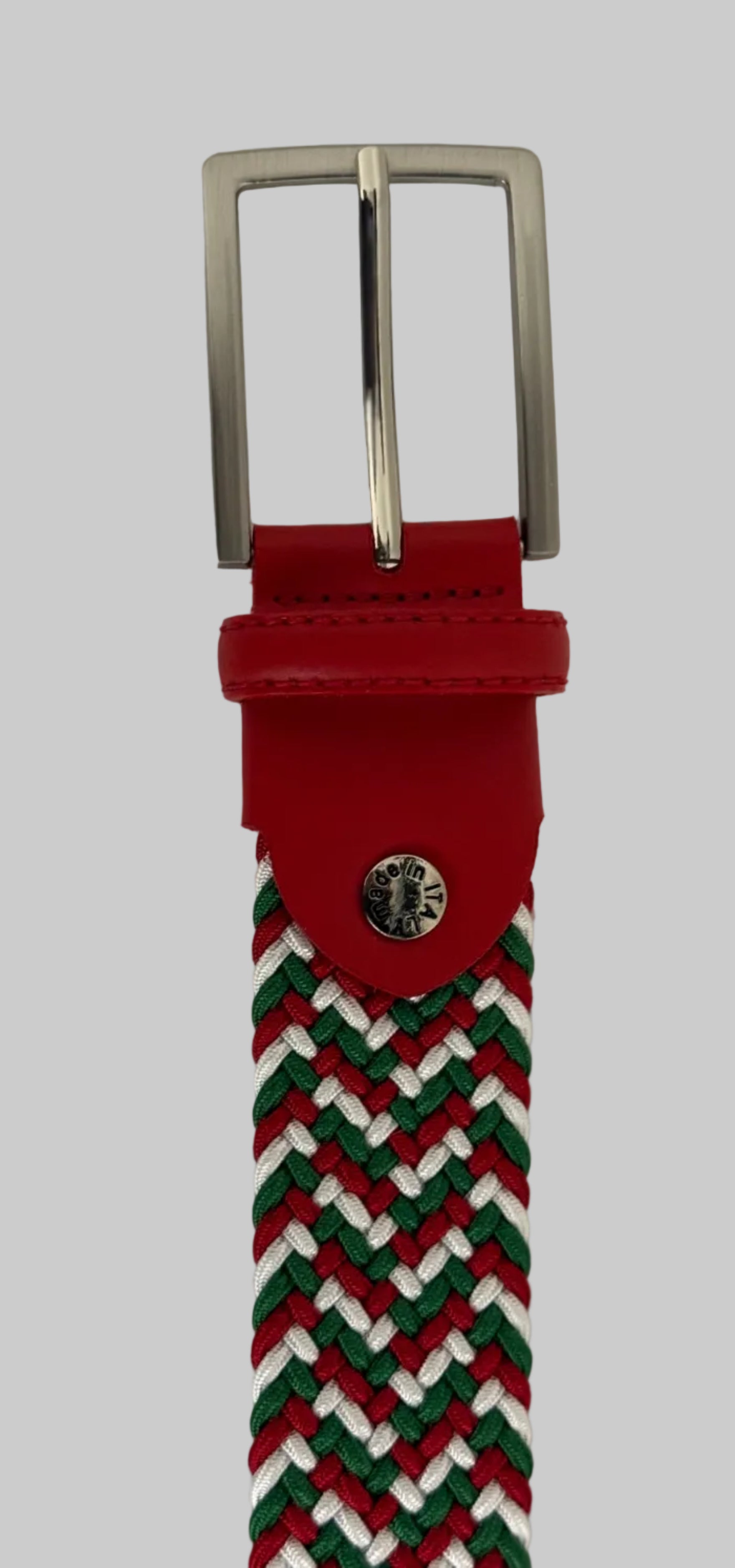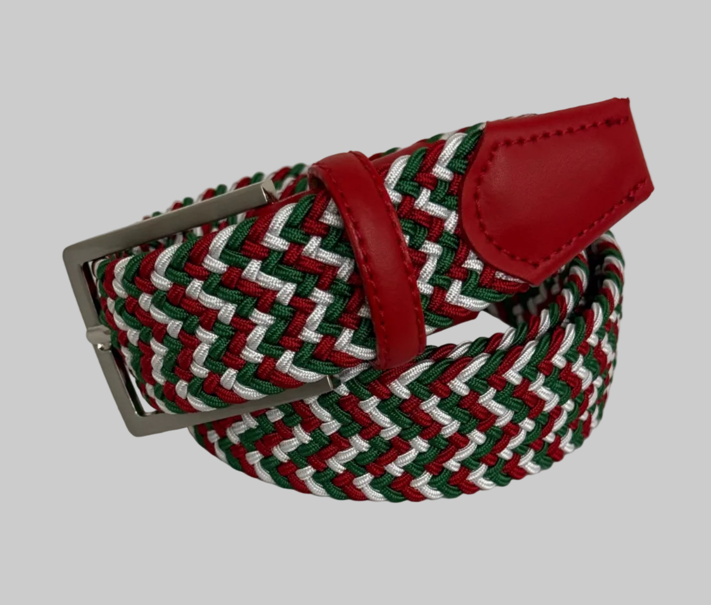 Red, Green, White Braided Stretch Belt With Red Genuine Leather Tipping