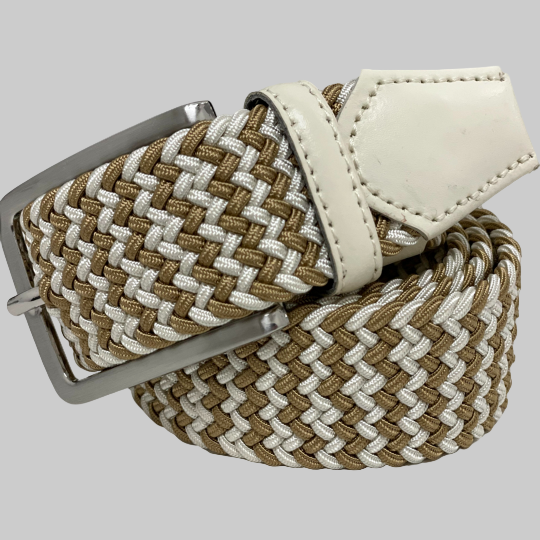 Made in Germany Compliment your Jeans or Trousers with our awesome stretch braided belt. Comfort is King. Gold & Cream Braided with Cream Genuine Leather Stretch Width 35 mm Order 1 size greater than pant size. Made in Germany