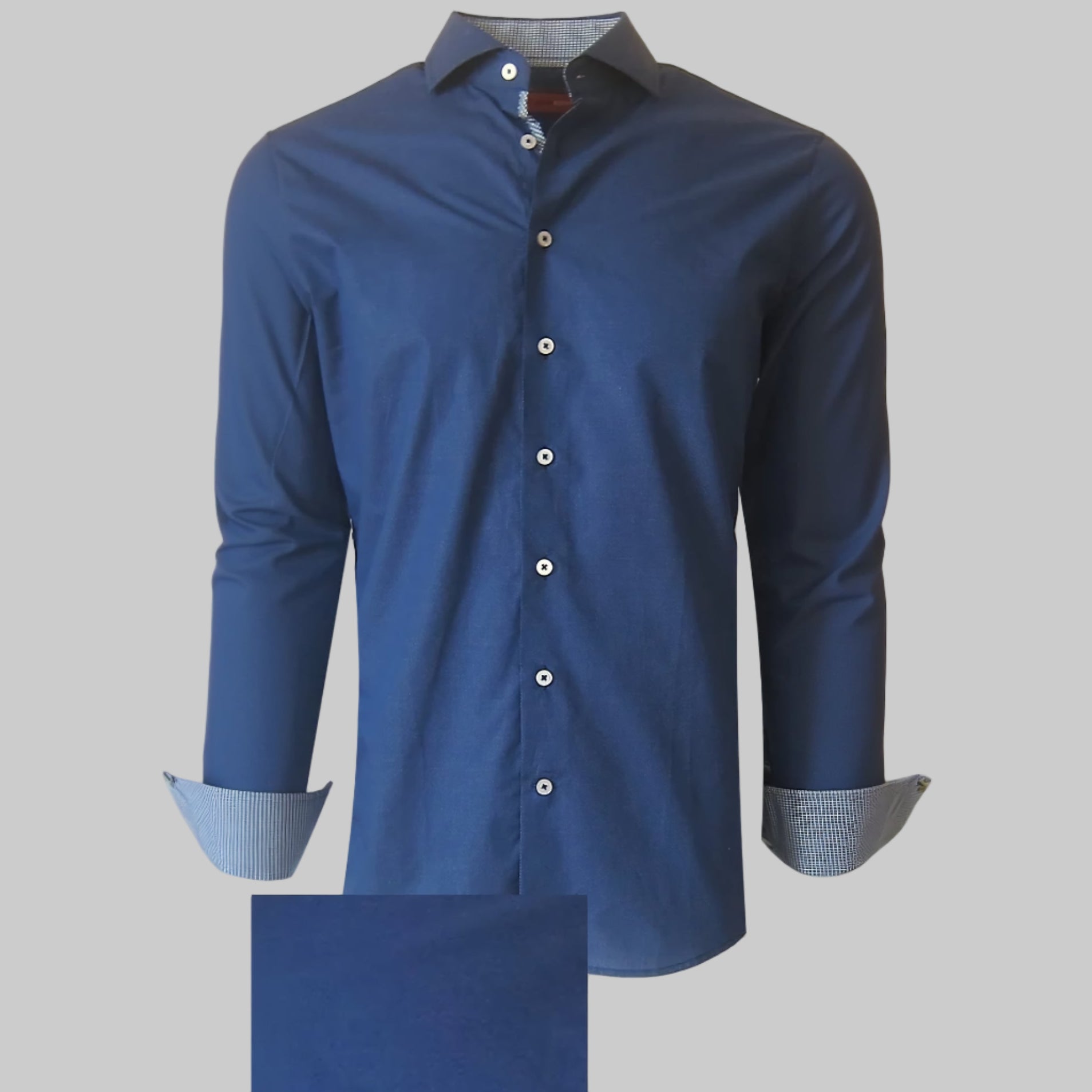 A mini blue birdseye with a complimentary navy & white pattern inside the cuffs, collar stand and front piping add the twist to a classic.