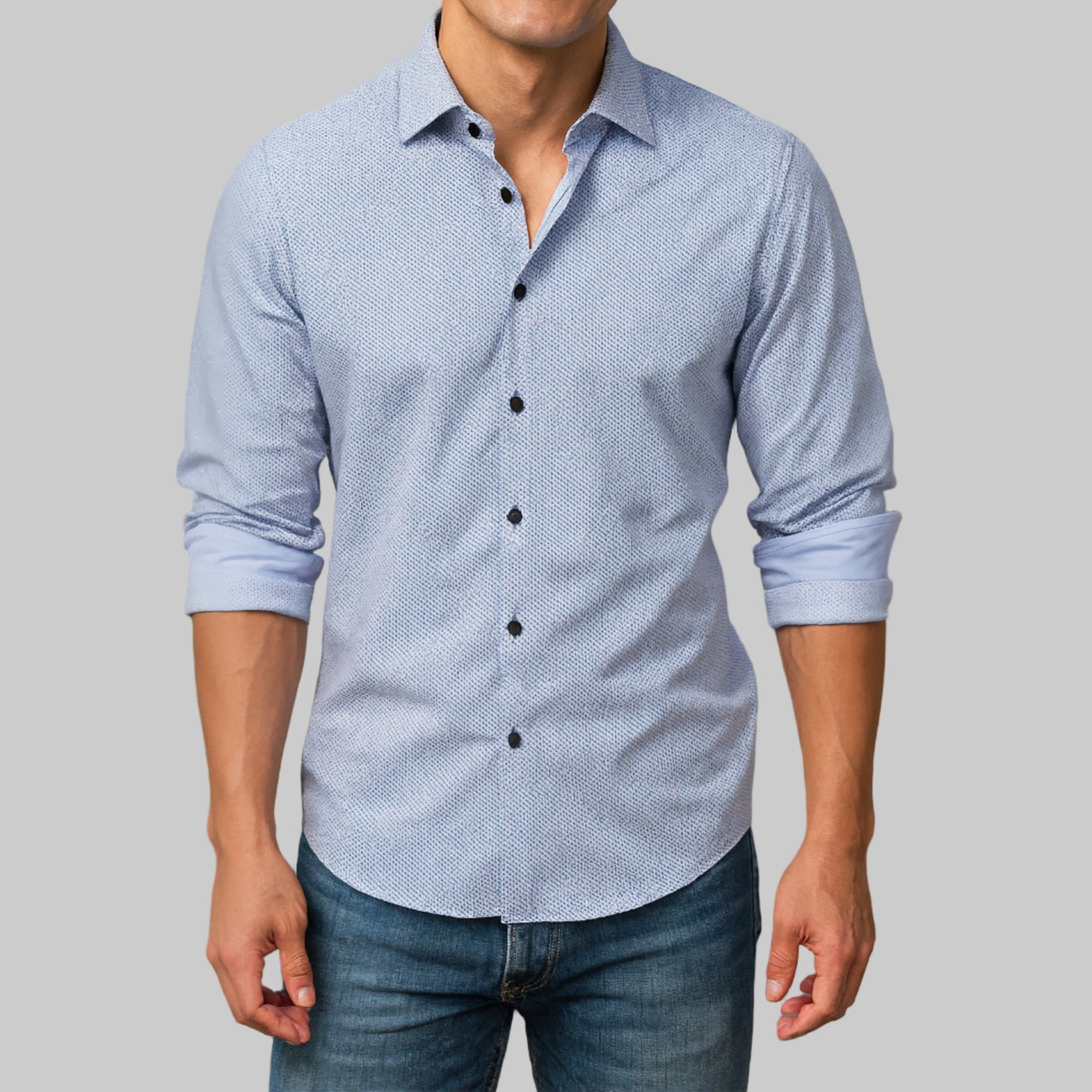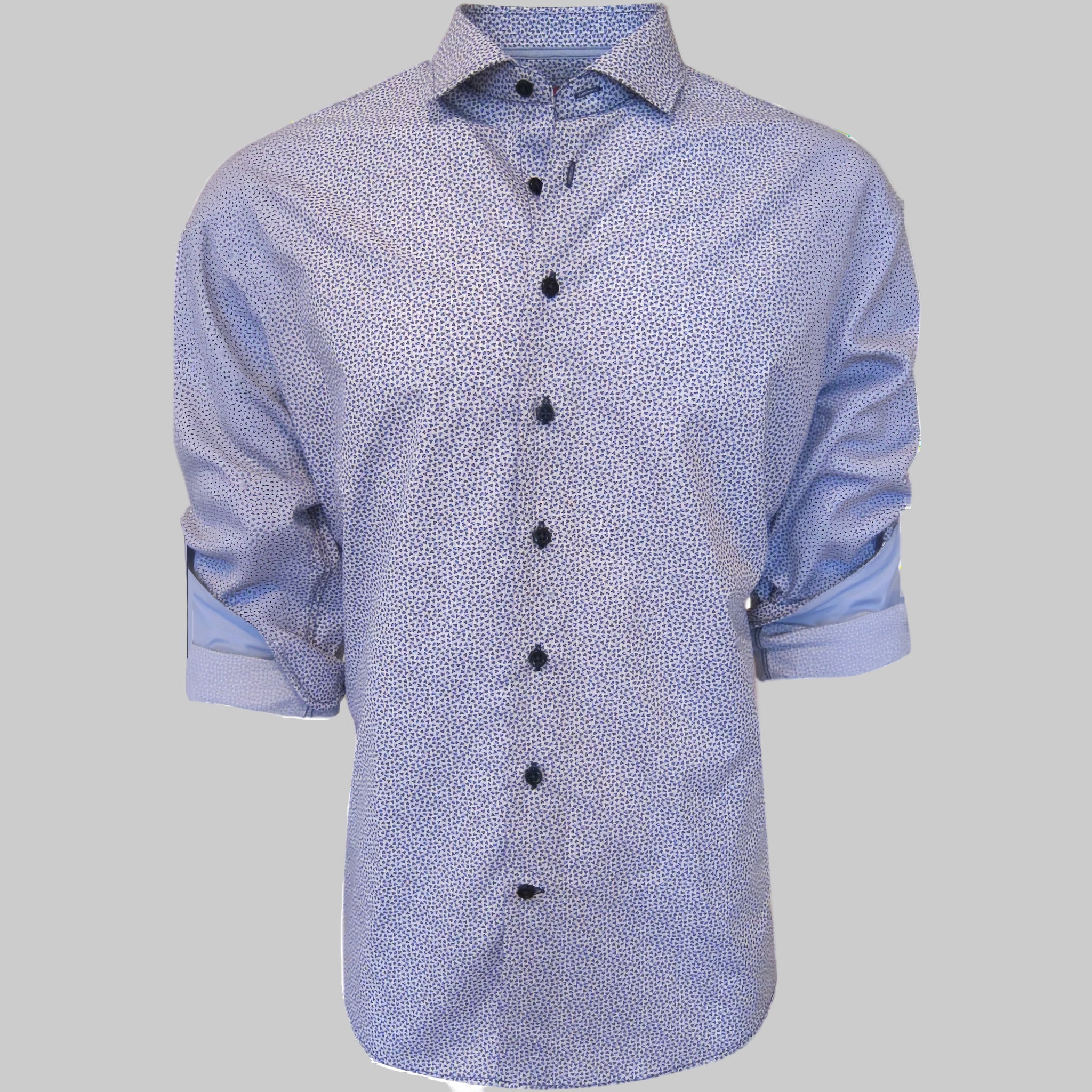 Simplicity at it's finest! Very "in" and totally versatile ! This is a 100% super soft Pima cotton. The mini motif leaf pattern is in Blue, Royal and a hint of Lilac. A Powder Blue companion pattern embellishes the cuffs when they are rolled. Georg Roth selects colors and patters that are complimentary to most any pant or jean and this is no exception. Perfect with Navy, Black, Blue, Brown... A shirt for any occasion...A shirt that you will feel your best in.