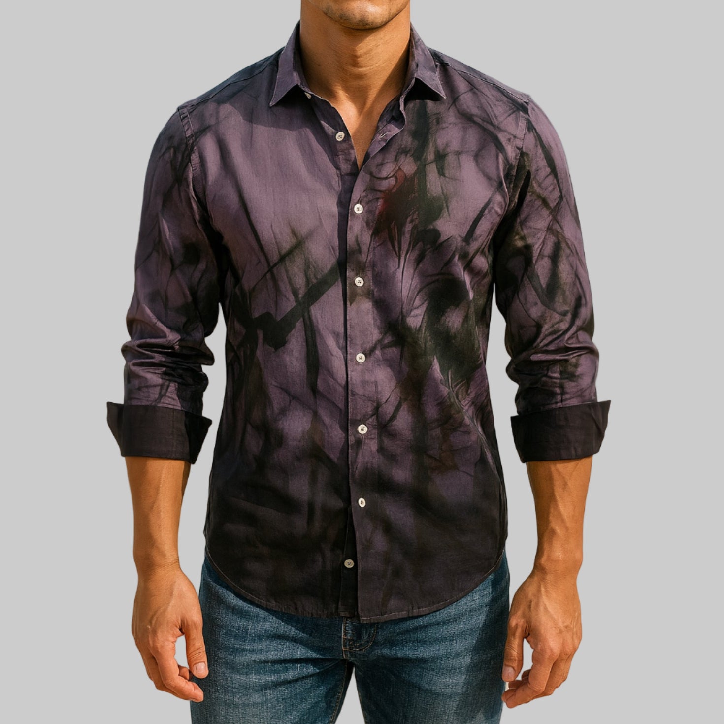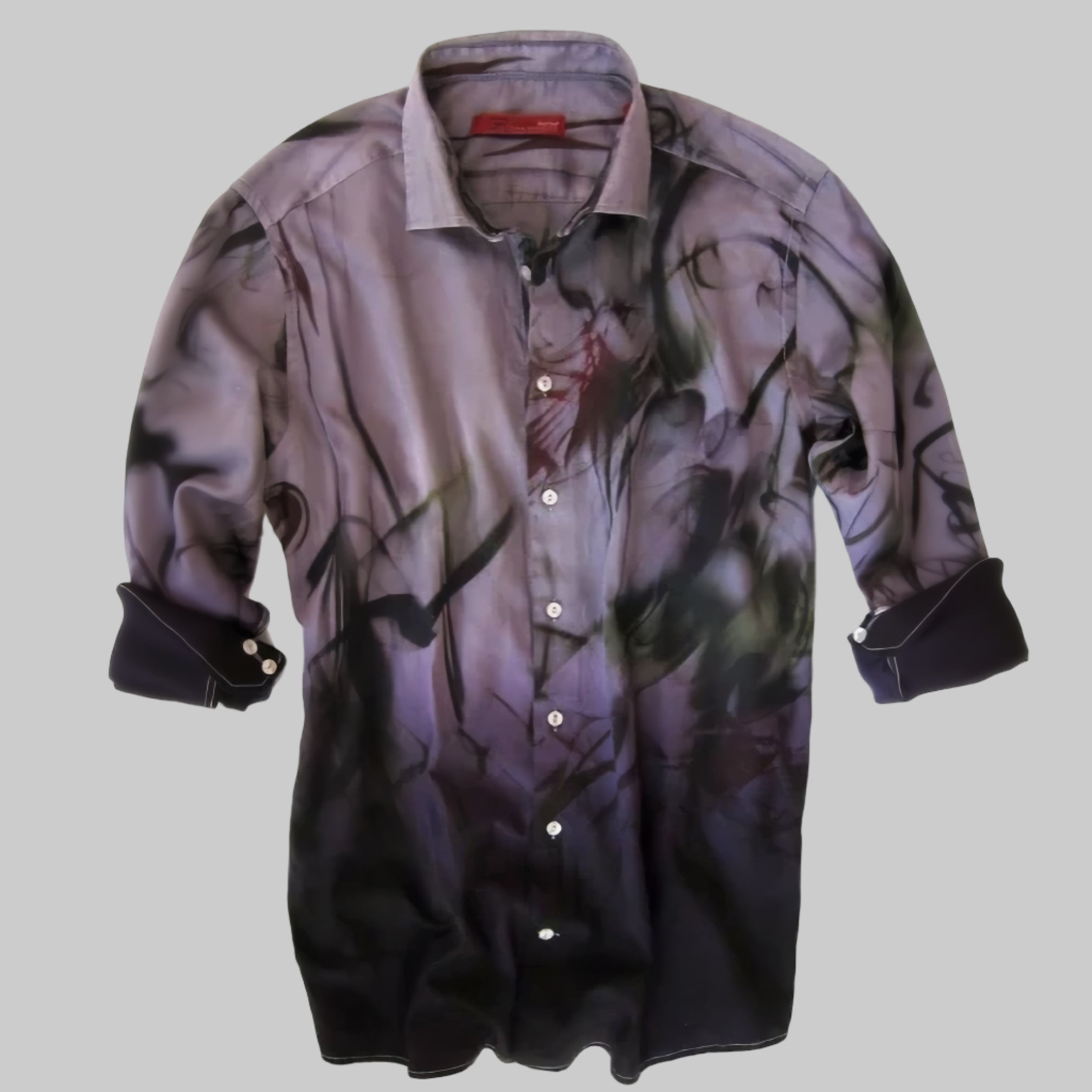 "It's the most wonderful time of the year".........and what could be better than to kick off the season with a Georg Roth design. Indulge yourself! Purples are so "in" and this shirt says it all. Tones of purples on this handsome Art pattern lends itself to high style with that look of distinction and sophistication that everyone tries to achieve. As always our finest imported cotton is tailored to perfection and the inside cuff of the sleeve is in a solid darker fabric to add a complimentary touch to this already great look. With jeans or pants......a business meeting or party......daytime or evening ...for fashion at it's best, this is for you!