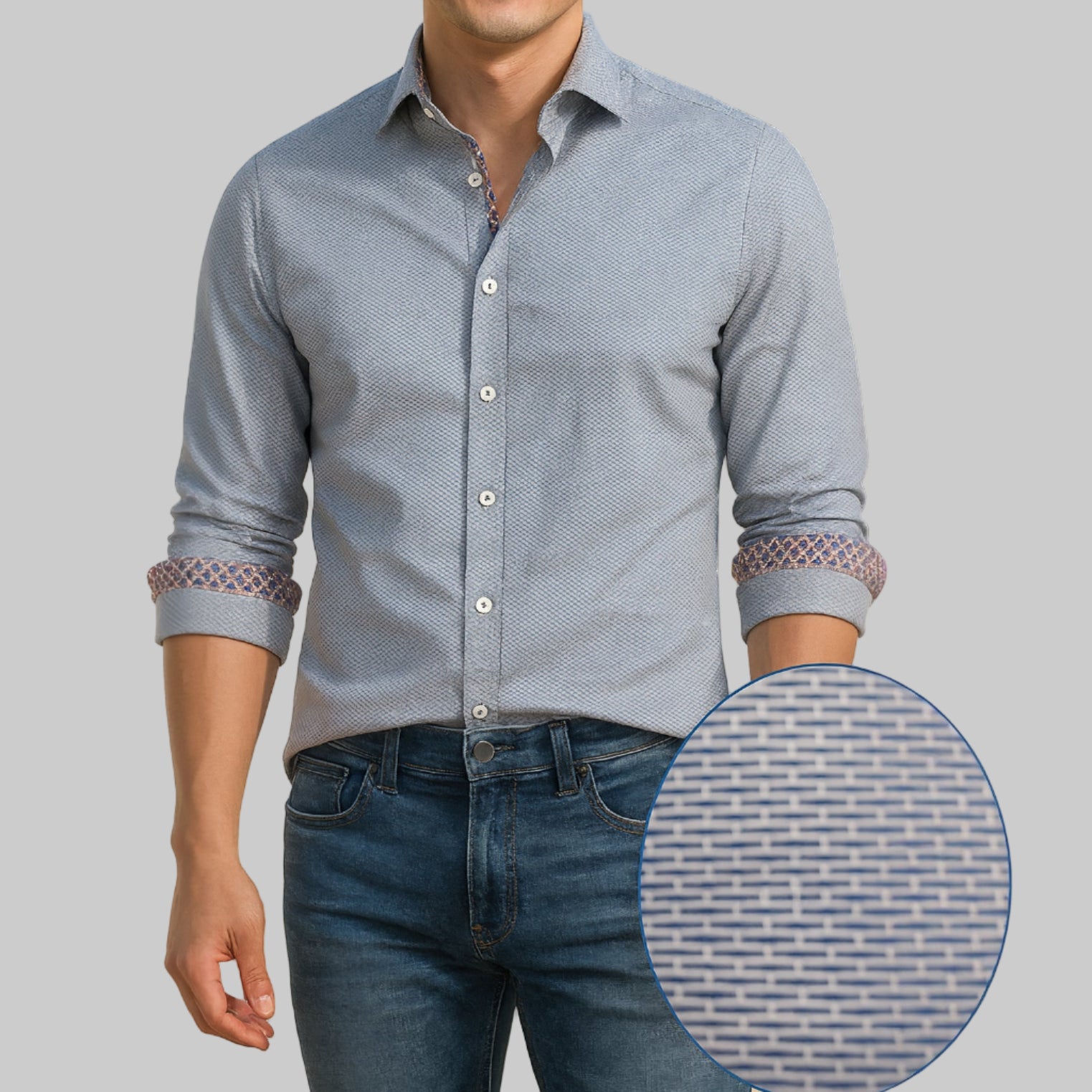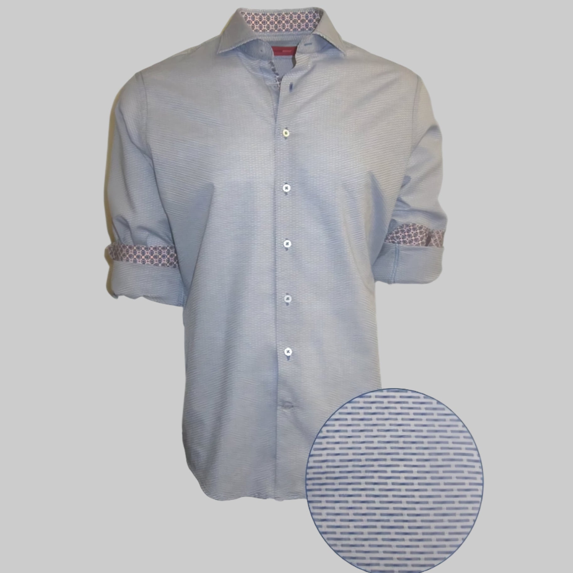 This blue tonal woven all over pattern is striking and sophisticated with a fun mix of pattern play inside the collar and cuffs.