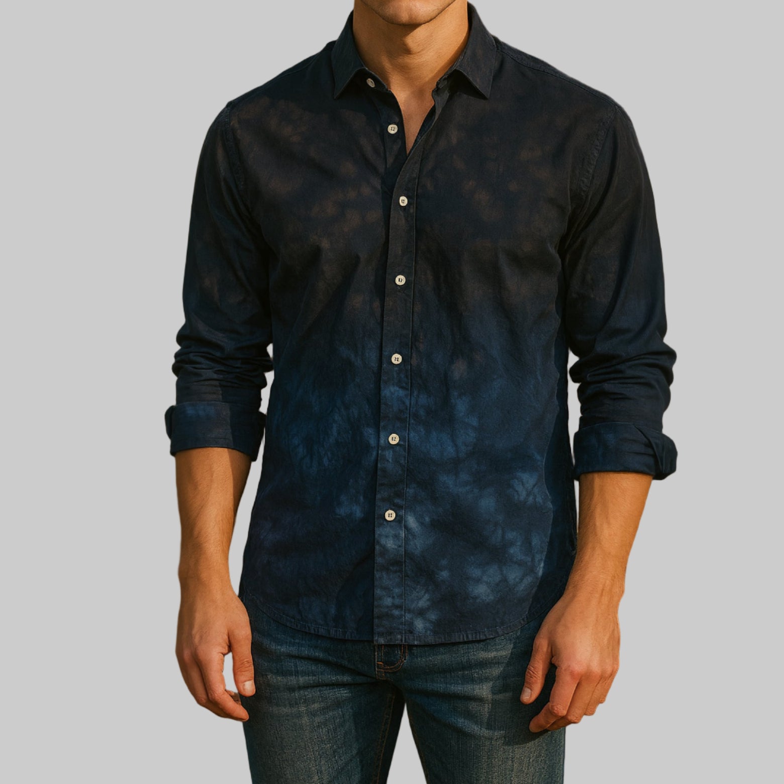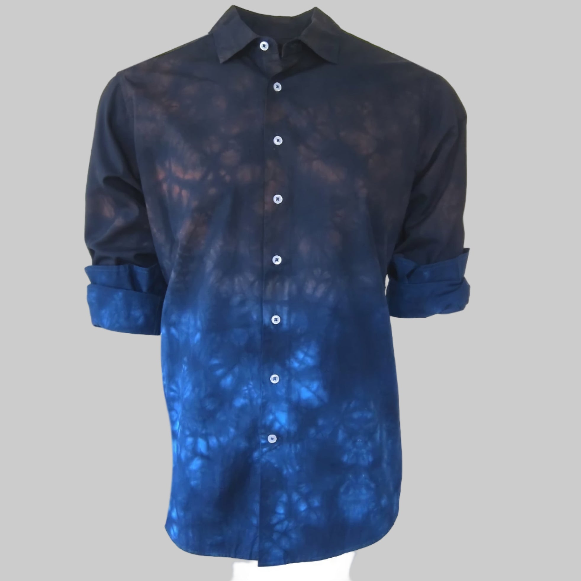 Awesome best describes this very rich print in Navy, Chocolate, Royal and black! A very special piece Georg created for the love of a rich autumn look to wear day into evening. On its own, or worn open with a Tee (GRLA V ROYAL), it is definitely a work of art that you will always feel fantastic in.