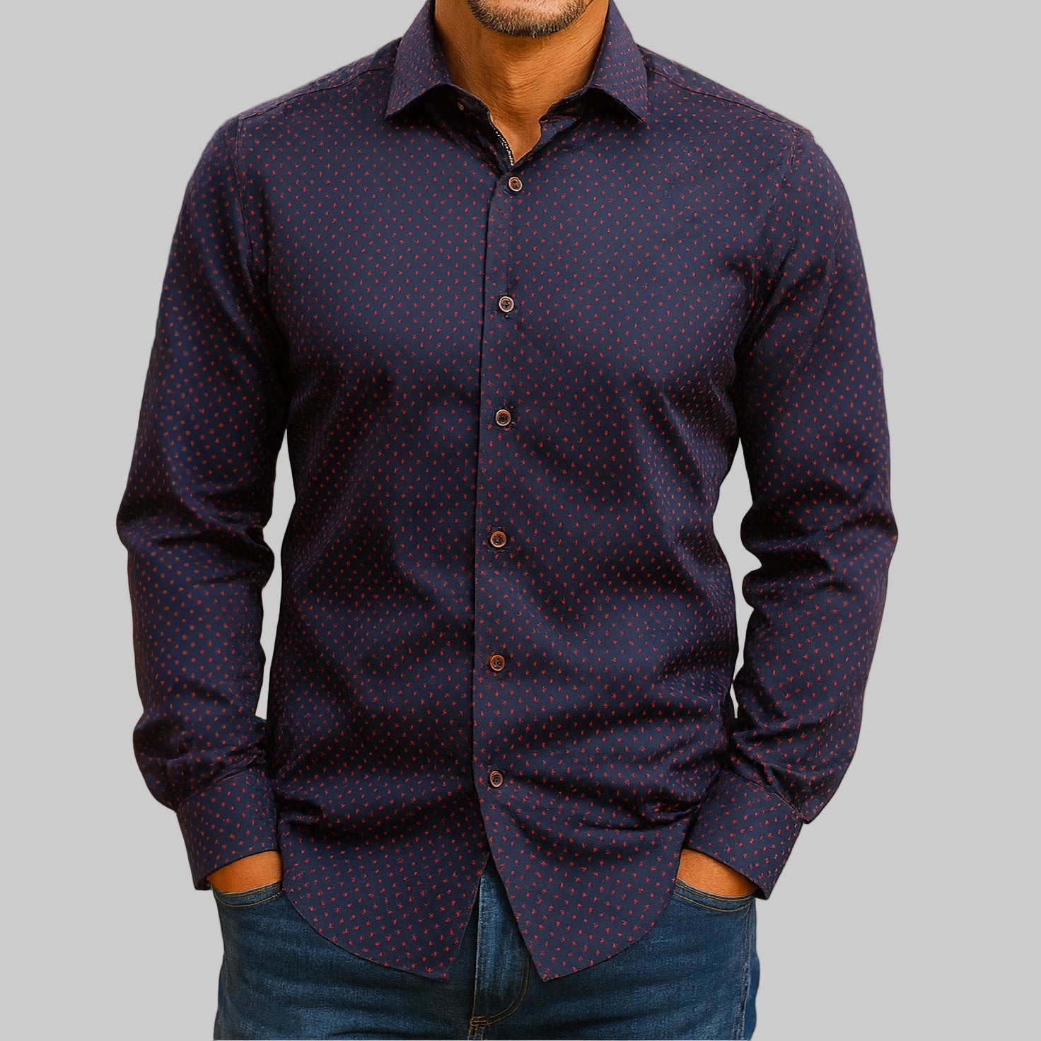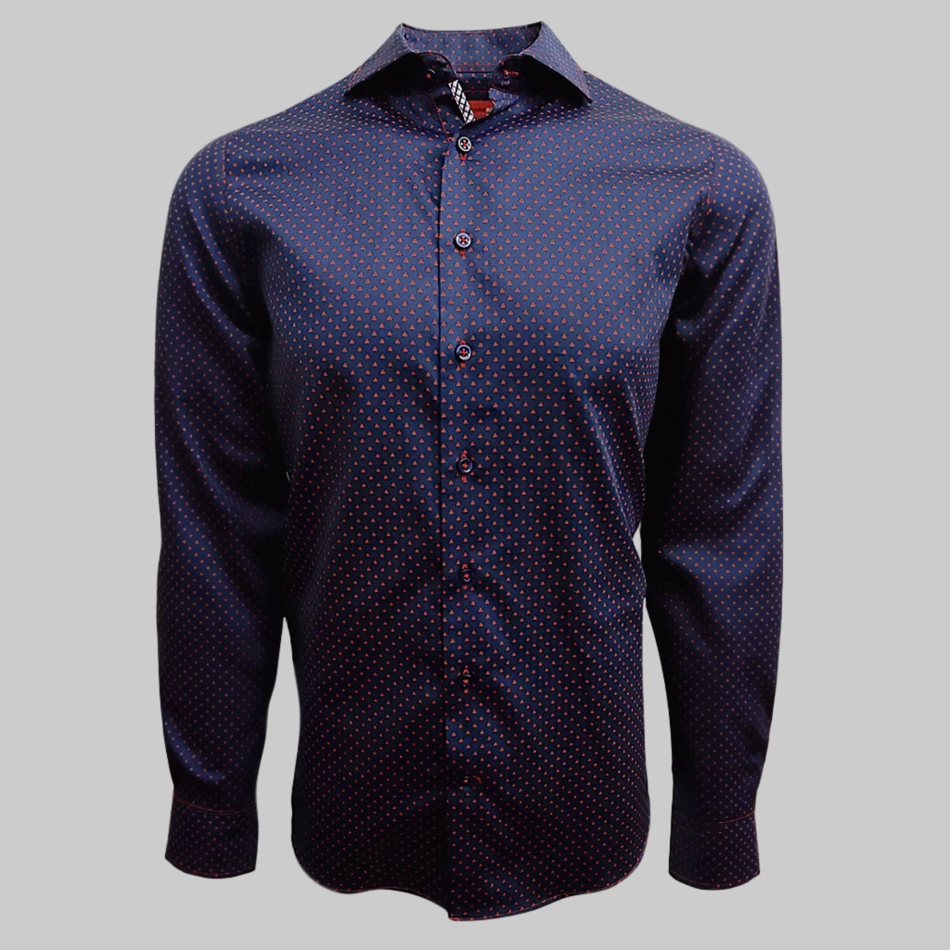Richness and elegance describes this beautiful Navy & Red cotton weave fabrication. A shirt to dress up, or go casual and roll the sleeves showing off the classic navy and white mini check inside the collar stand, front placket piping and cuffs.