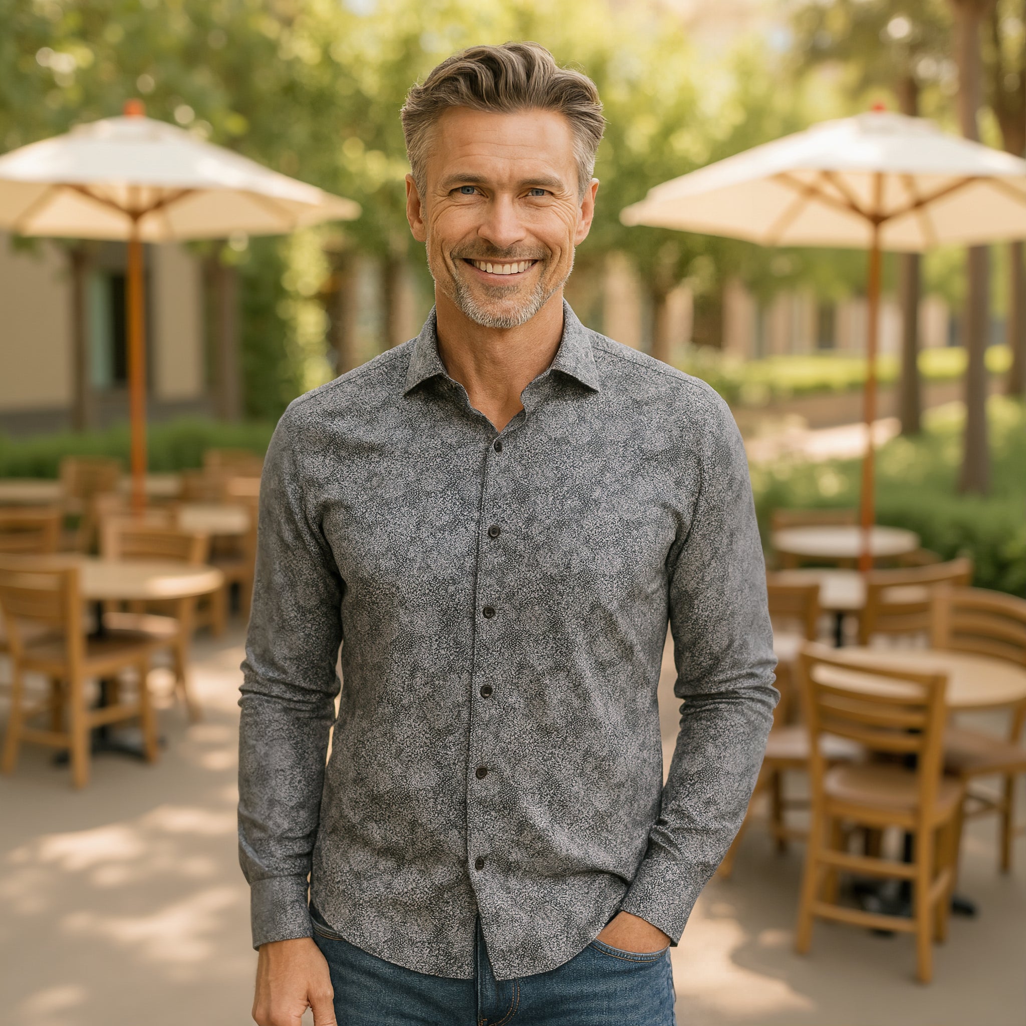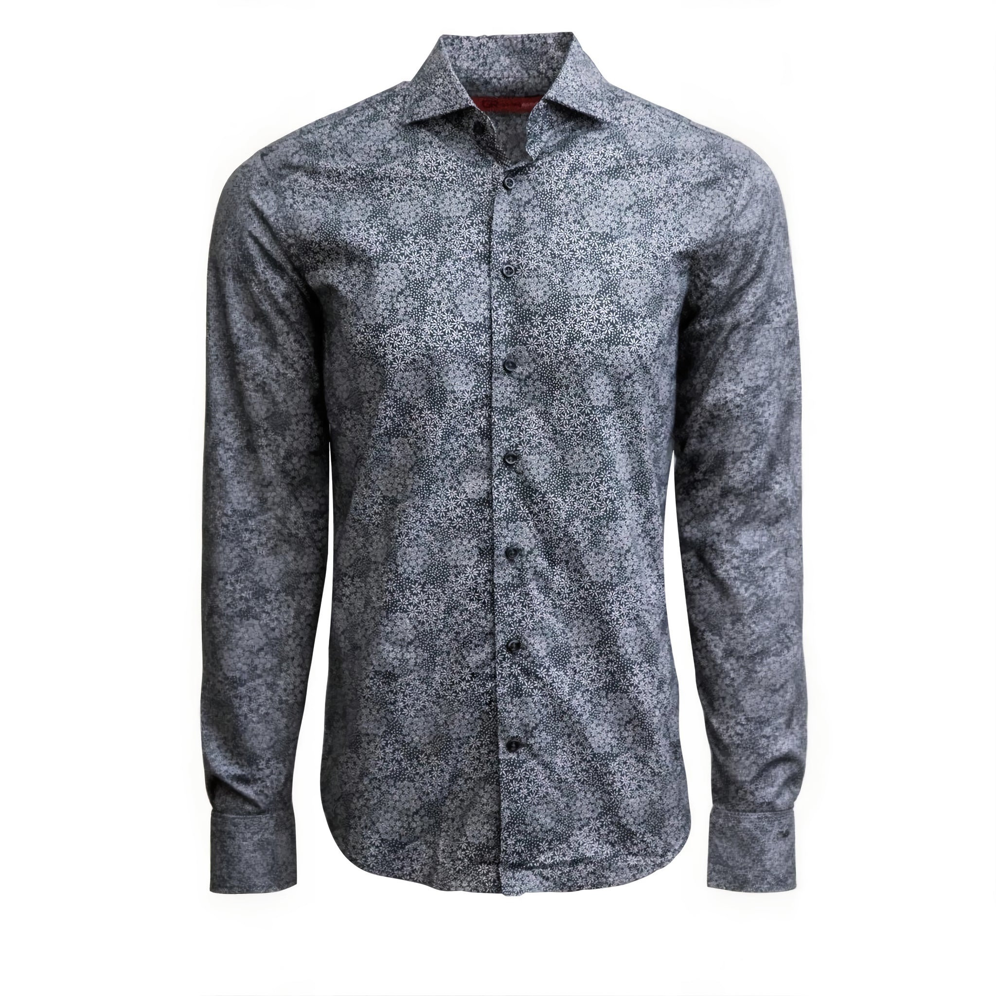 Super soft Pima in a rich charcoal and white floral print. Cuffs and inner placket are trimmed with a mini black and white check making this a fantastic look with denim for dress with a jacket or on its own with the Georg Roth roll of the sleeves.
