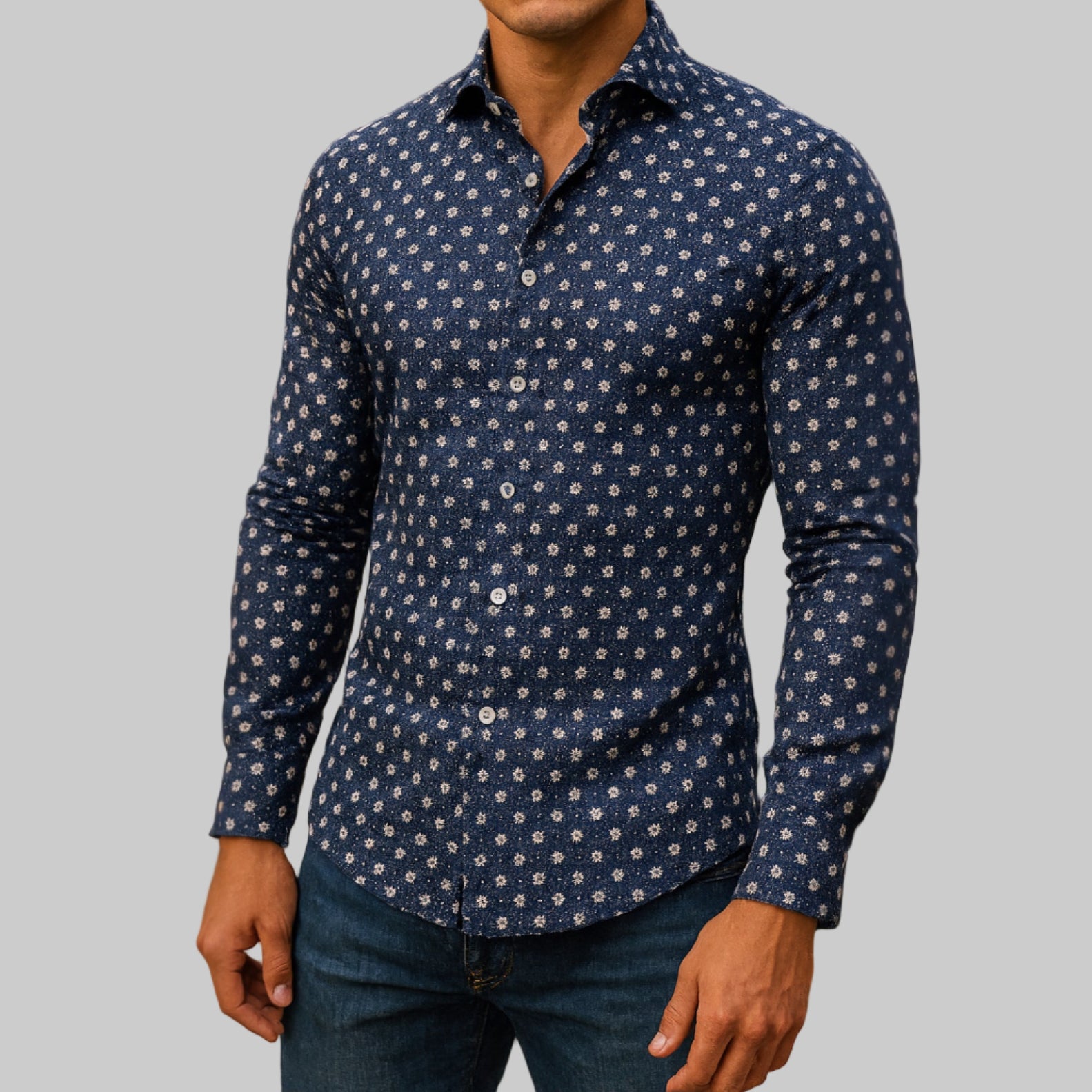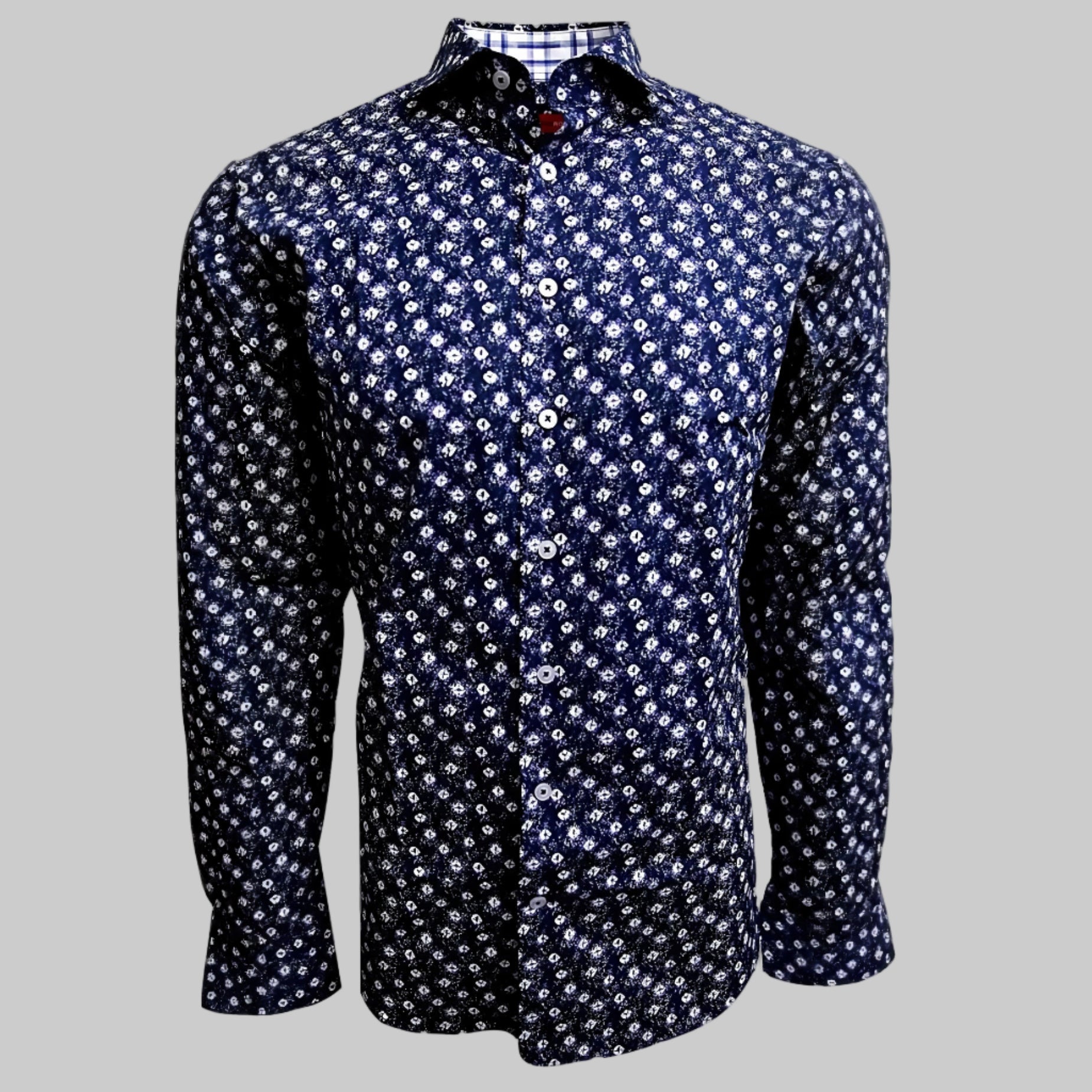 A stunning shade of indigo blue with white pattern is coordinated with a rich white, navy & grey plaid inside the collar stand and cuffs.