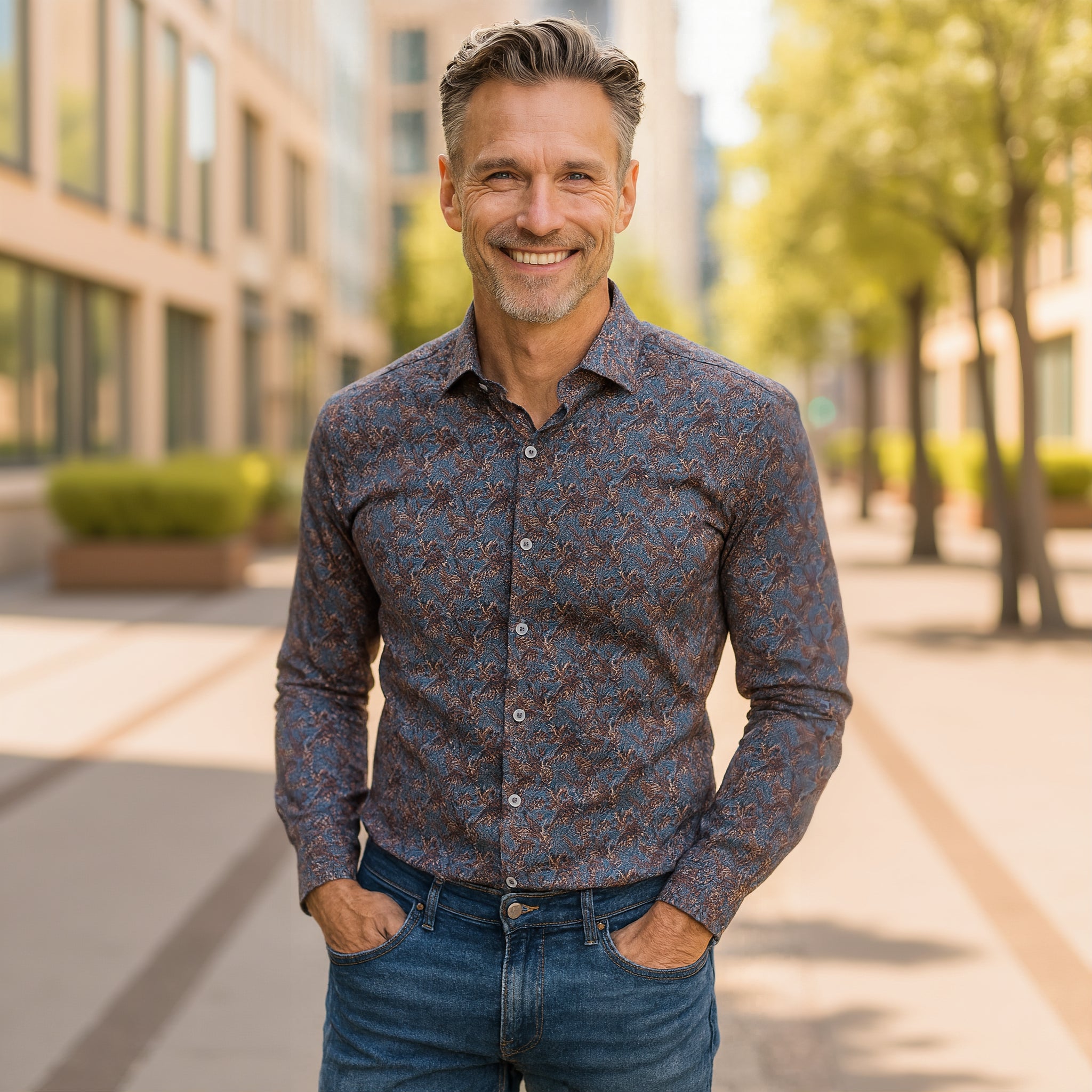 A rich and sophisticated floral on a super soft cotton. Stylish fun with jeans and khakis . Our amazing fit and style lets you wear this gem anywhere, anytime day into evening.