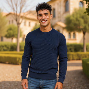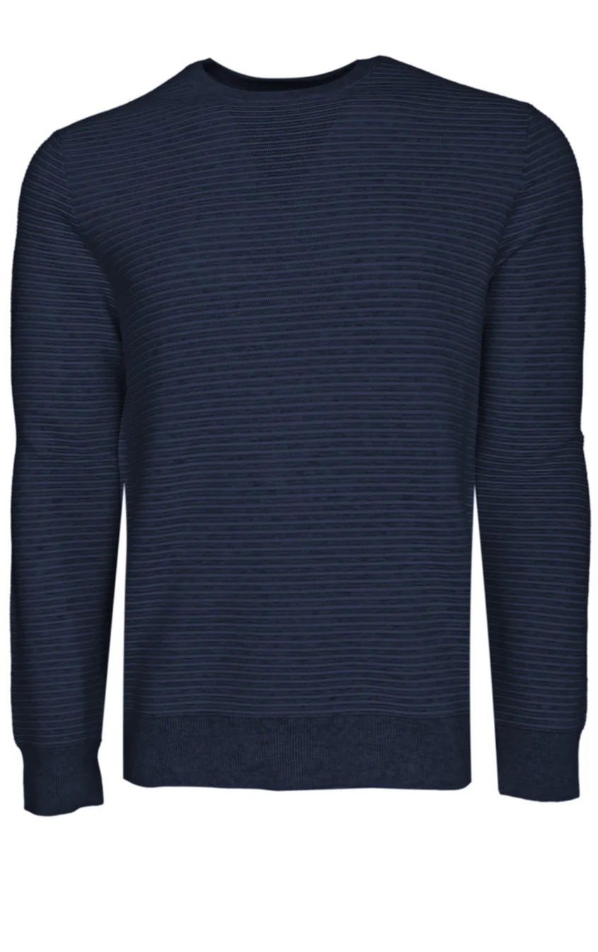 Pure comfort and style. 100% Cotton raised stripe in Navy pullover.