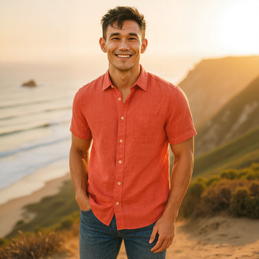 Perfect for warm weather our Short Sleeves Garment Dyed Linen Shirts in a vibrant garment dyed orange.